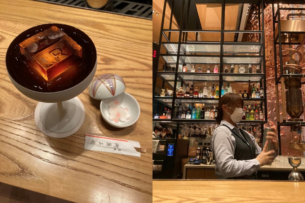 食小編在三樓的酒吧區和同行友人點了2杯咖啡調酒,基酒分別使用芋燒酎以及琴酒,咖啡與芋燒酎似乎很容易結合成咖啡酒,再搭配櫻花造型和菓子馬上就能展現和洋混融的風情,不過琴酒那杯則是完全無法想像2個獨立的味道如何成為一杯調酒。雖然星巴克的調酒師不會跟客人聊天(疫情關係),不過還是有欣賞到吧台正在調製這一杯,且很認真的看完了過程,完成品藉由檸檬、柑橘中間元素,完美連結起 cold brew coffee 與 gin tonic 兩個獨立飲品,視覺演出精彩、風味更是順口好喝!