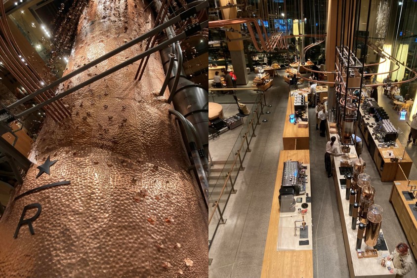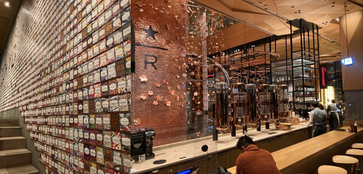 一樓除了展現咖啡文化設有咖啡烘焙機,也有義大利知名麵包店「PRINCI」進駐,提供與飲品相搭的餐食,往二樓前進時有整面馬克杯拼貼而成牆面的設計,吸引來客停留拍照,二樓是星巴克茶品牌TEAVANA的專區,無法喝咖啡的客人也能在這個樓層享受各式茶飲與茶點。然後前往三樓的牆面則是由咖啡袋標籤品成的意象牆。